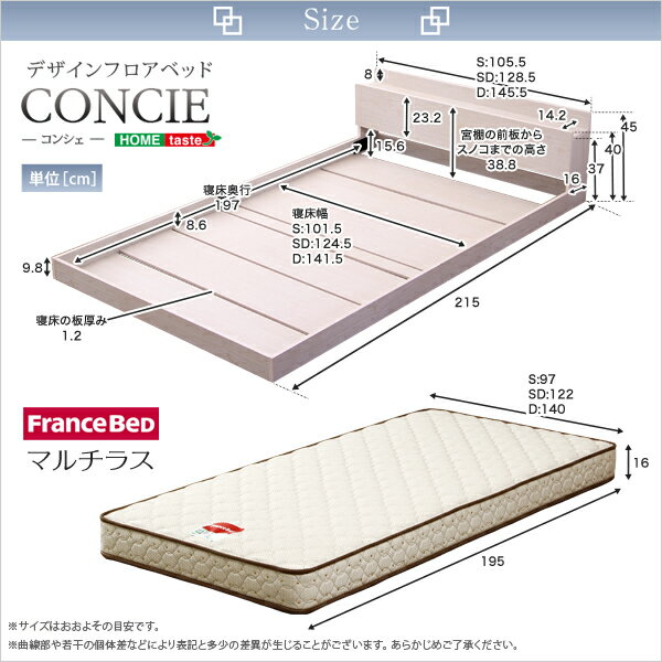 【商品について】デザインフロアベッド【コンシェ-CONCIE-(シングル)】(マルチラススーパースプリングマットレス付き)■サイズ:(本体)(約)幅105.5cmx奥215cmx高45cm (マットレス)(約)幅97x奥行き195x高さ16cm (約)17kg■カラー:ホワイトオーク■素材:(本体)パーチクルボード、MDF、表面材:プリント紙化粧合板(マットレス)側地:ポリエステル60%、綿20%、レーヨン20%中材:マルチラススプリング、パームパッド、ウレタンフォーム、フェルト、樹脂綿、不織布■その他:・お客様組立商品です・梱包サイズ:(本体)(1-2)(約)122cmx27.4cmx14.5cm(2-2)(約)109cmx32.3cmx9.5cm(マットレス)(約)98x196x17cm(12才)(約)18kg※こちらの商品はメーカー受注生産商品のため、ご注文後のキャンセルは対応できません。