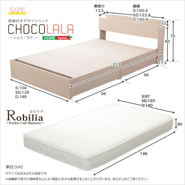 【商品について】収納付きデザインベッド【ショコ・ララ-CHOCOLALA-(ダブル)】(ロール梱包のポケットコイルスプリングマットレス付き)■サイズ:外寸:(ベッド)(約)幅146x奥213x高70cm(約)64kg(マットレス)(約)幅140x奥行き195x高さ20cm(約)25kg■カラー:ウォールナットオーク※マットレスは一種類のみ■素材:(ベッド)パーチクルボード、MDF、表面材:プリント紙化粧合板(マットレス)側地:ポリエステル100%中材:ポケットコイル、ウレタンフォーム、フェルト、不織布■その他:・お客様組立商品です・梱包サイズ:(ベッド本体)(1-3)(約)162x45.2x12.1cm(2-3)(約)114x47.6x9.6cm(3-3)(約)146.5x51x10cm(約)68.81kg(マットレス)(約)40x40x145cm(8.7才)(約)27kg収納付きデザインベッド【ショコ・ララ-CHOCOLALA-】単品シングルセミダブルダブルロール梱包のポケットコイルスプリングマットレス付きシングルセミダブルダブルロール梱包のボンネルコイルマットレス付きシングルセミダブルダブルボンネルコイルスプリングマットレス付きシングルセミダブルダブル羊毛入りデュラテクノマットレス付きシングルセミダブルダブルデュラテクノマットレス付きシングルセミダブルダブルマルチラススーパースプリングマットレス付きシングルセミダブルダブル